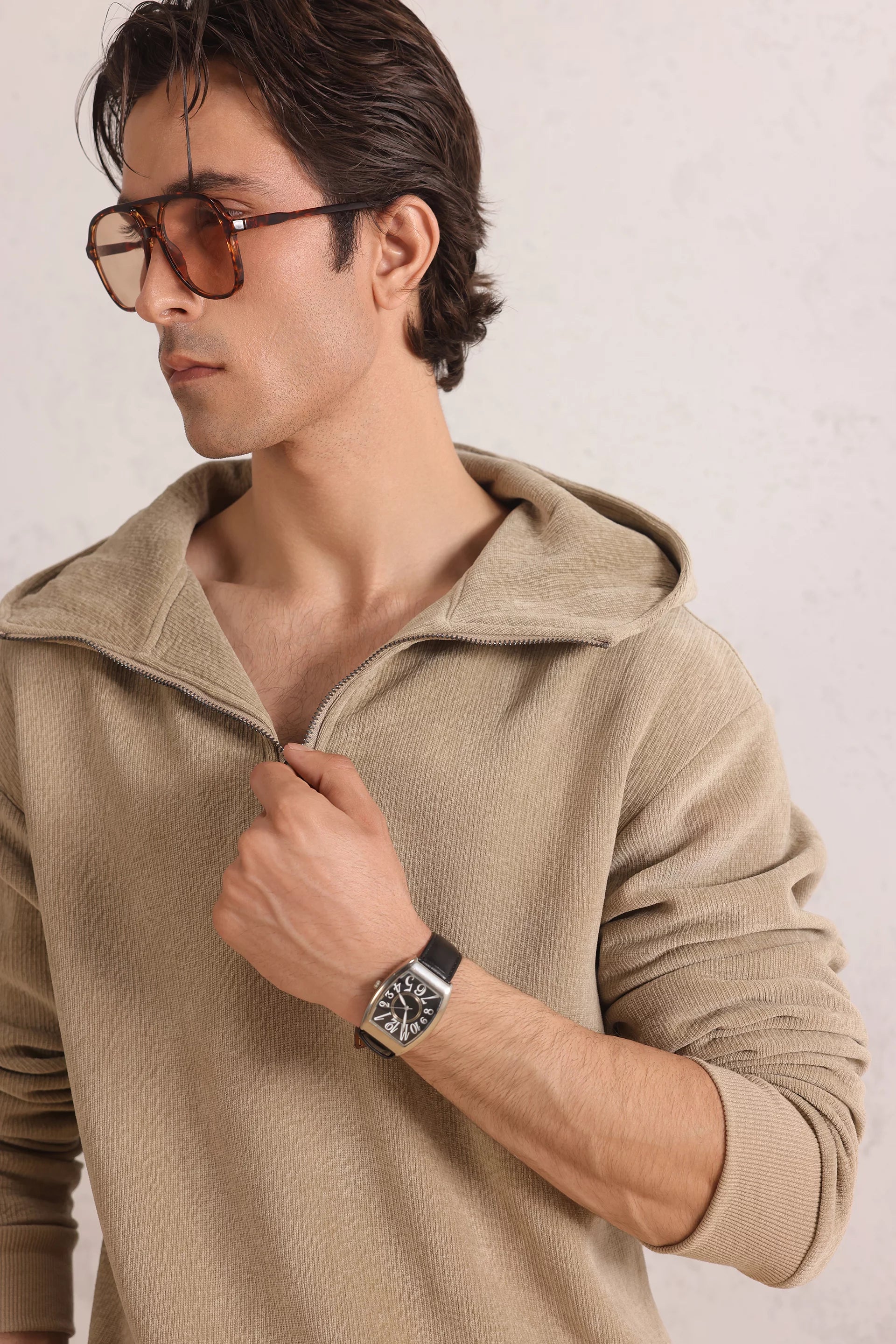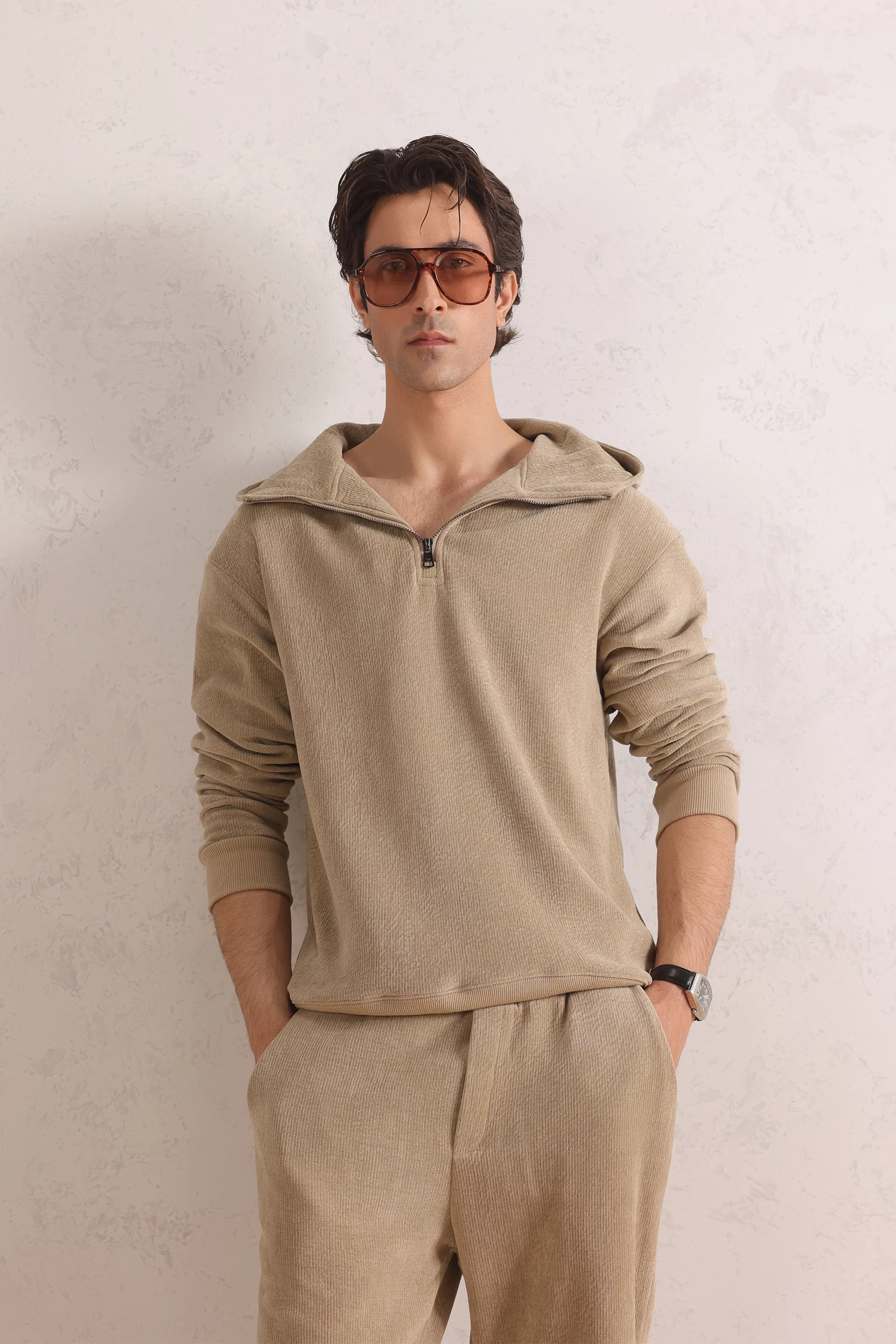 Elevate your smart-casual wardrobe with this refined corduroy co-ord set. The pullover features a quarter-zip closure and hood for versatile layering, complemented by full sleeves and ribbed cuffs for a polished finish. The coordinating trousers showcase a tailored silhouette with a zip fly, practical cross pockets, and a back patch pocket. Constructed from durable corduroy fabric, this set delivers understated charm and timeless sophistication.