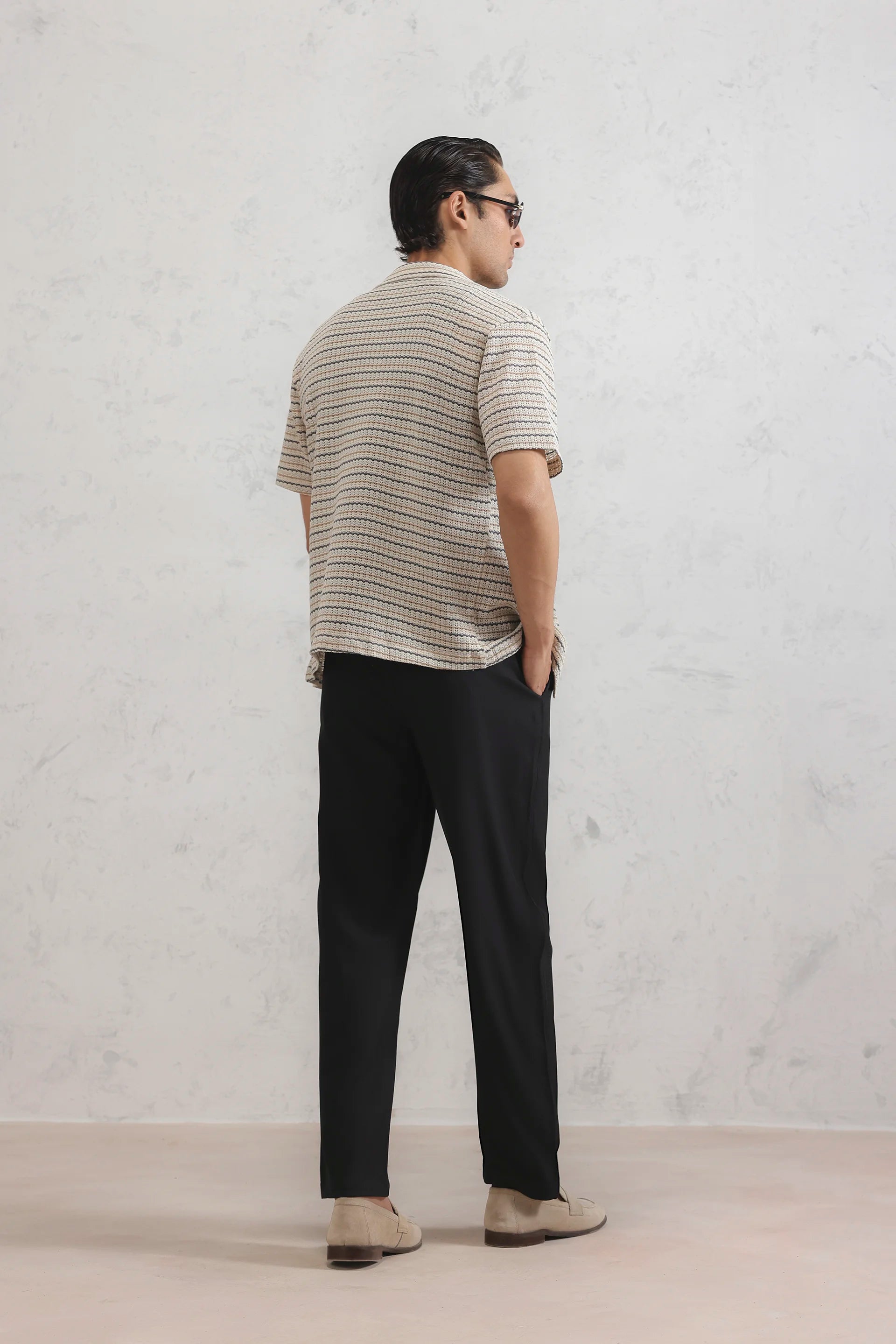 - Design Details: Resort collar, short sleeves, front-button closure, straight-cut hemline, horizontal zig-zag knit stripe texture
