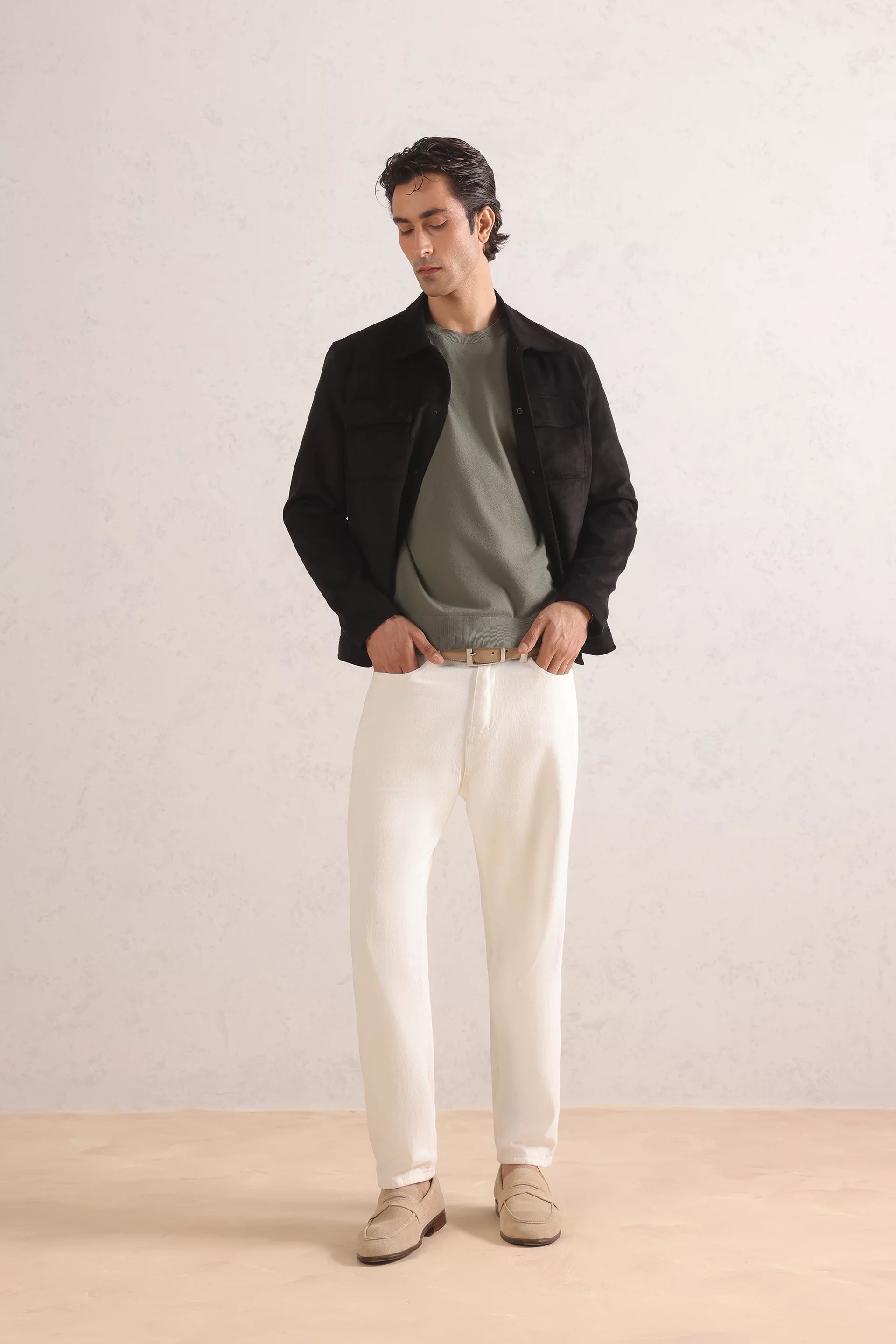 This refined Suede Collar Jacket exhibits thoughtful construction details. The structured shirt collar and button-front design create a sophisticated silhouette, while dual flap chest pockets with snap closures and side welt pockets offer practical functionality. Rendered in luxurious beige suede, this piece is an essential addition to any discerning wardrobe.