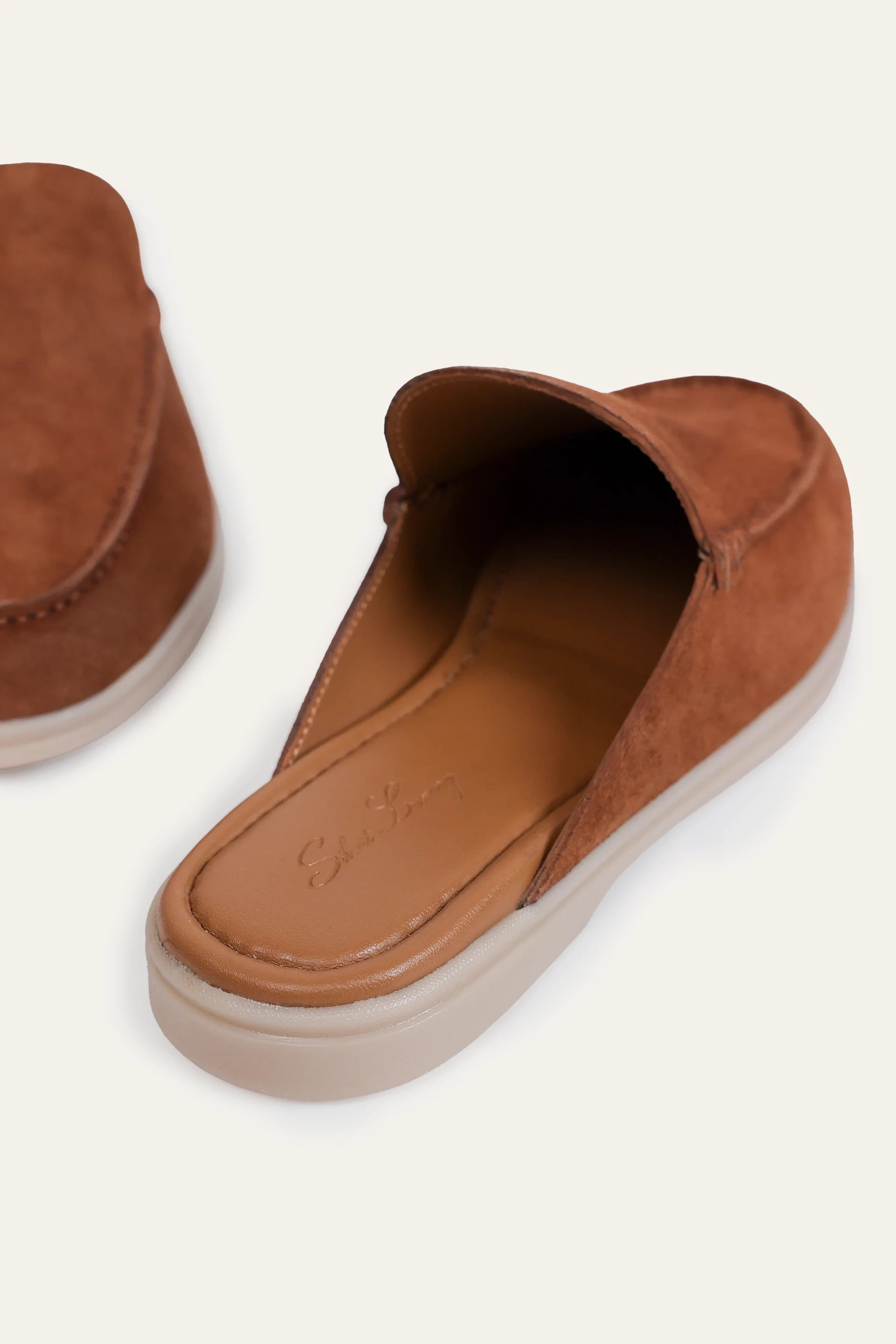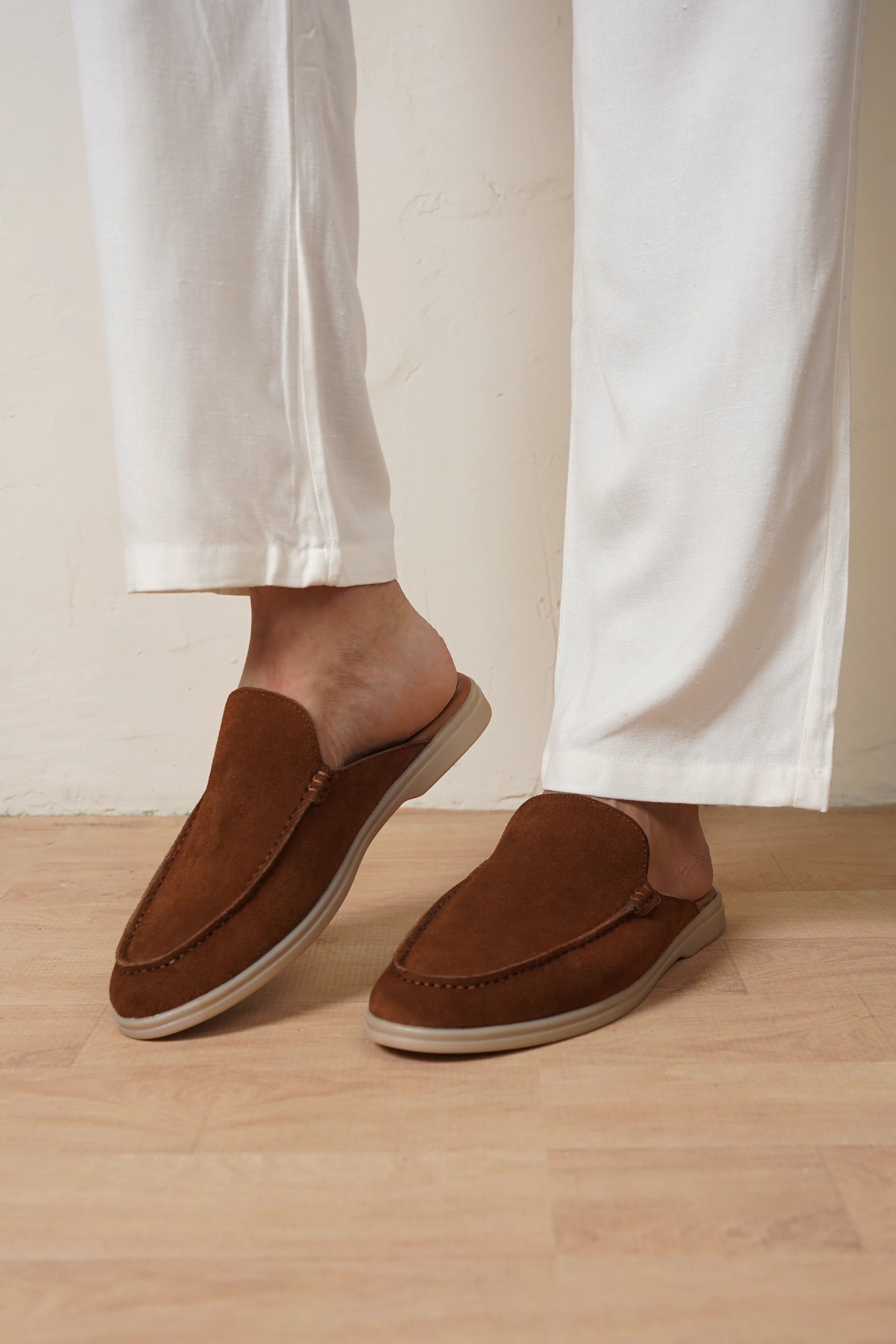These Brown Suede Leather Mules embody understated luxury with thoughtfully engineered details. Paneled vamp construction accented by refined top stitching creates visual depth, while the flexible contrast rubber sole balances comfort with sophistication. The rounded toe silhouette offers a graceful, wearable aesthetic.