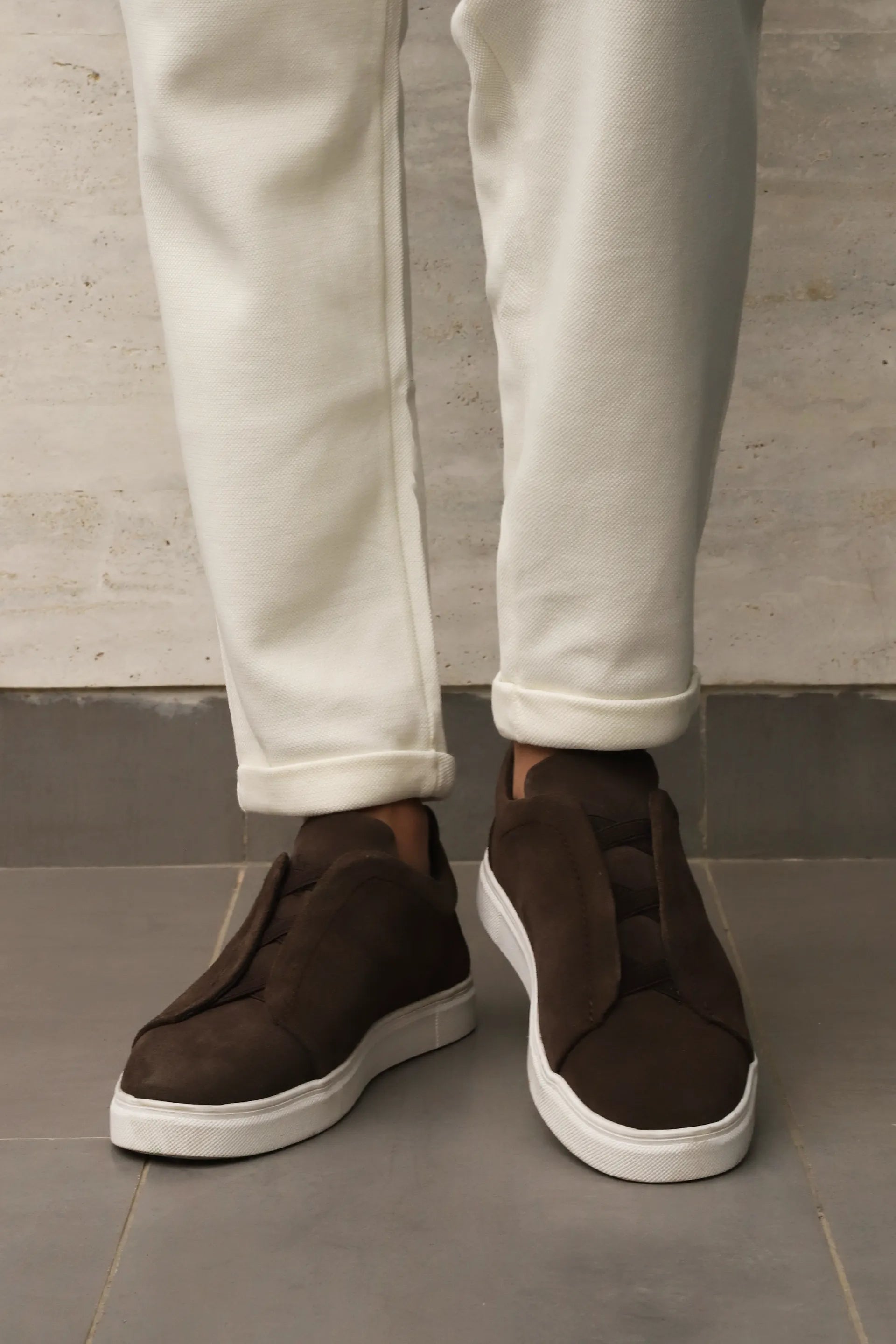 Crafted with refined sensibility, these Suede Slip-On Sneakers define contemporary luxury. The crossed elastics and convenient pull-on tab ensure seamless transitions throughout your day, while the supple suede upper delivers a soft touch against the skin. Anchored by a resilient rubber sole and rounded toe silhouette, these slip-on Sneakers balance practicality. The cushioned insole, subtly branded, provides gentle support for all-day wear.