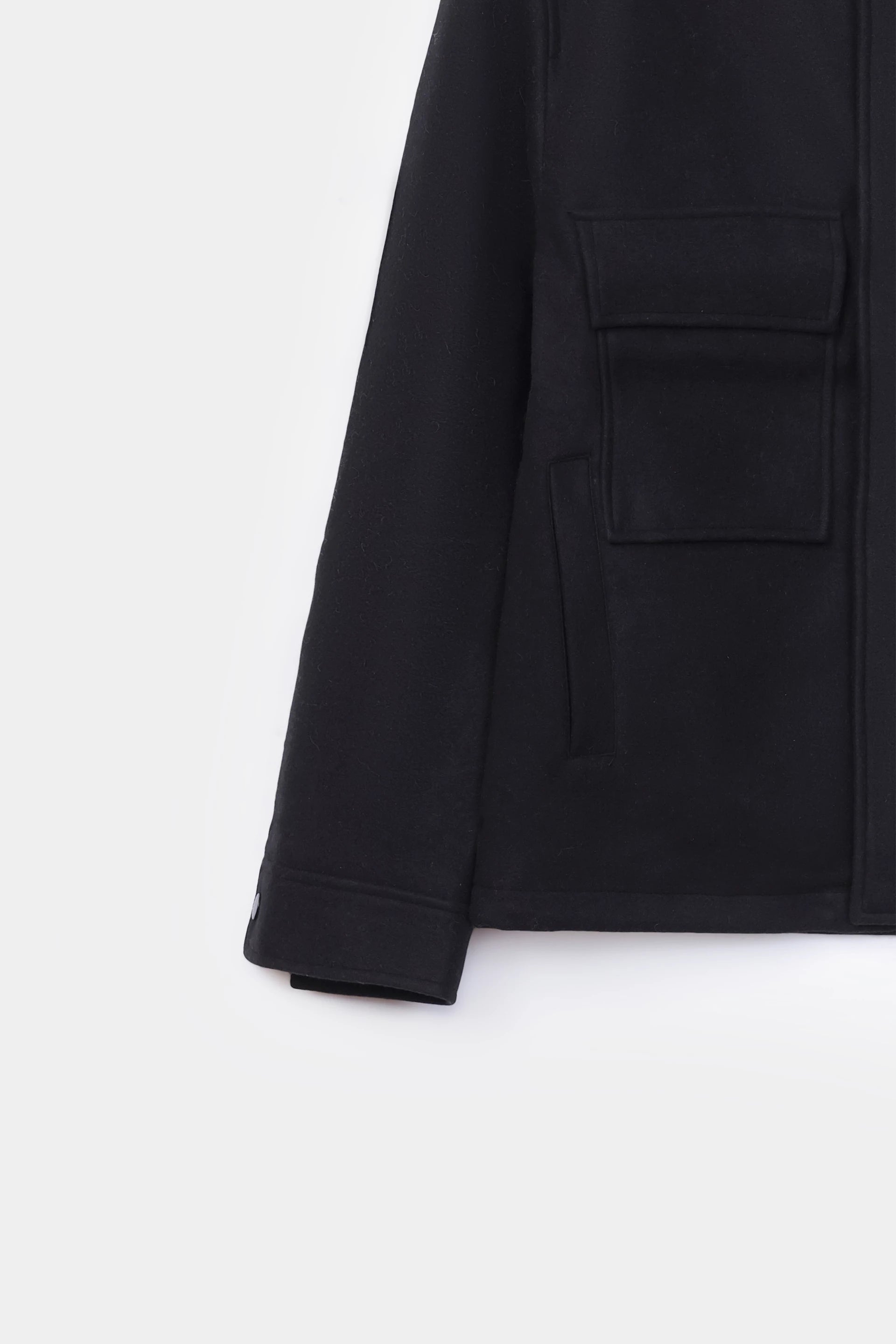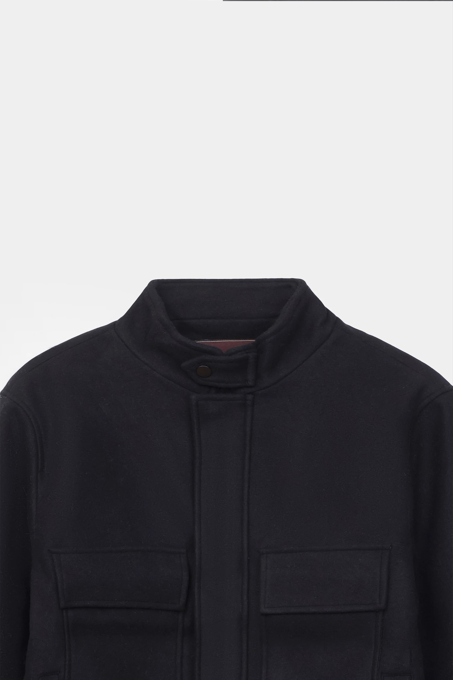 Design Details: Stand collar with snap-button tab closure, zip front, flap pockets and side welt pockets, simple stitching outlining the major seams, rugged aesthetics