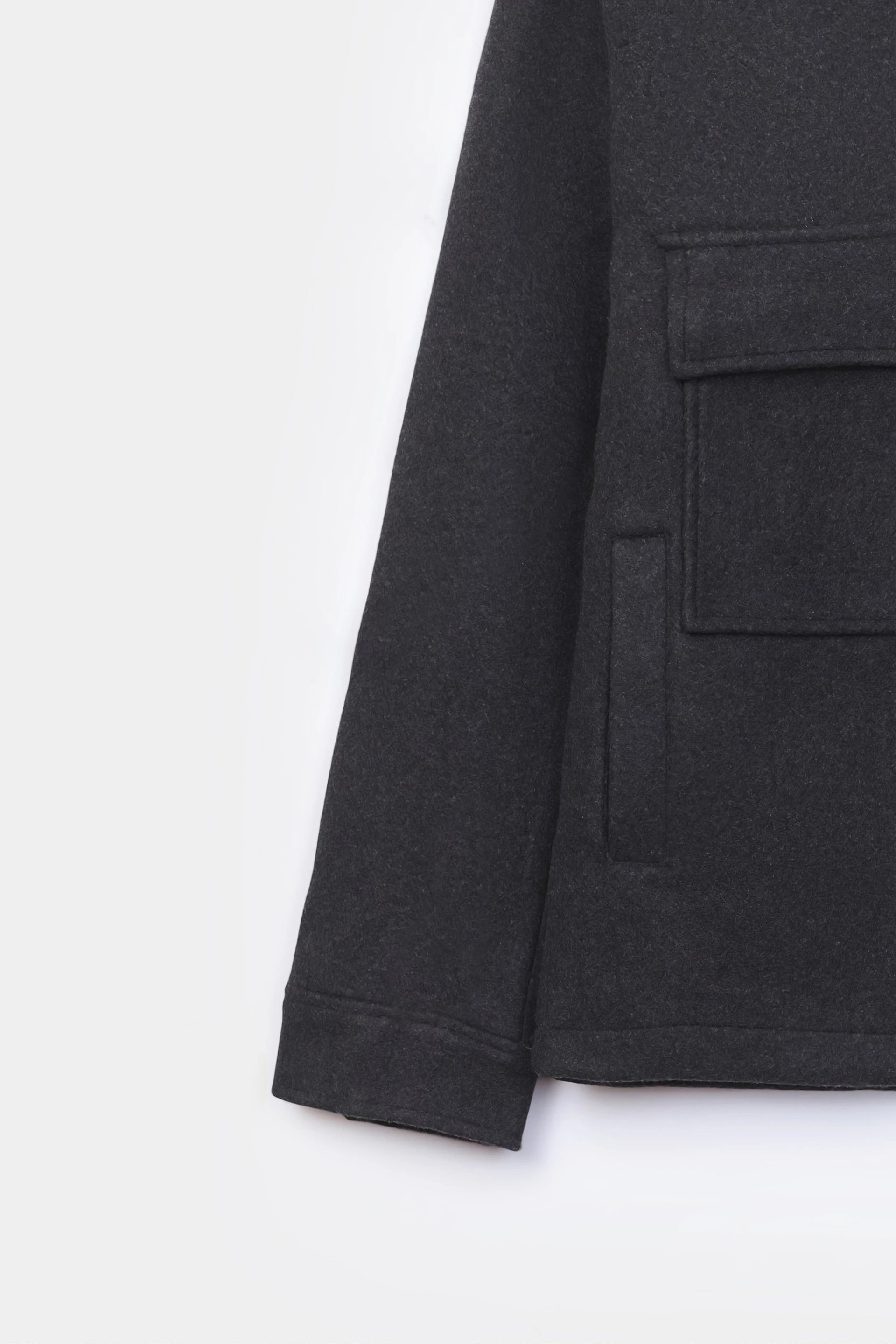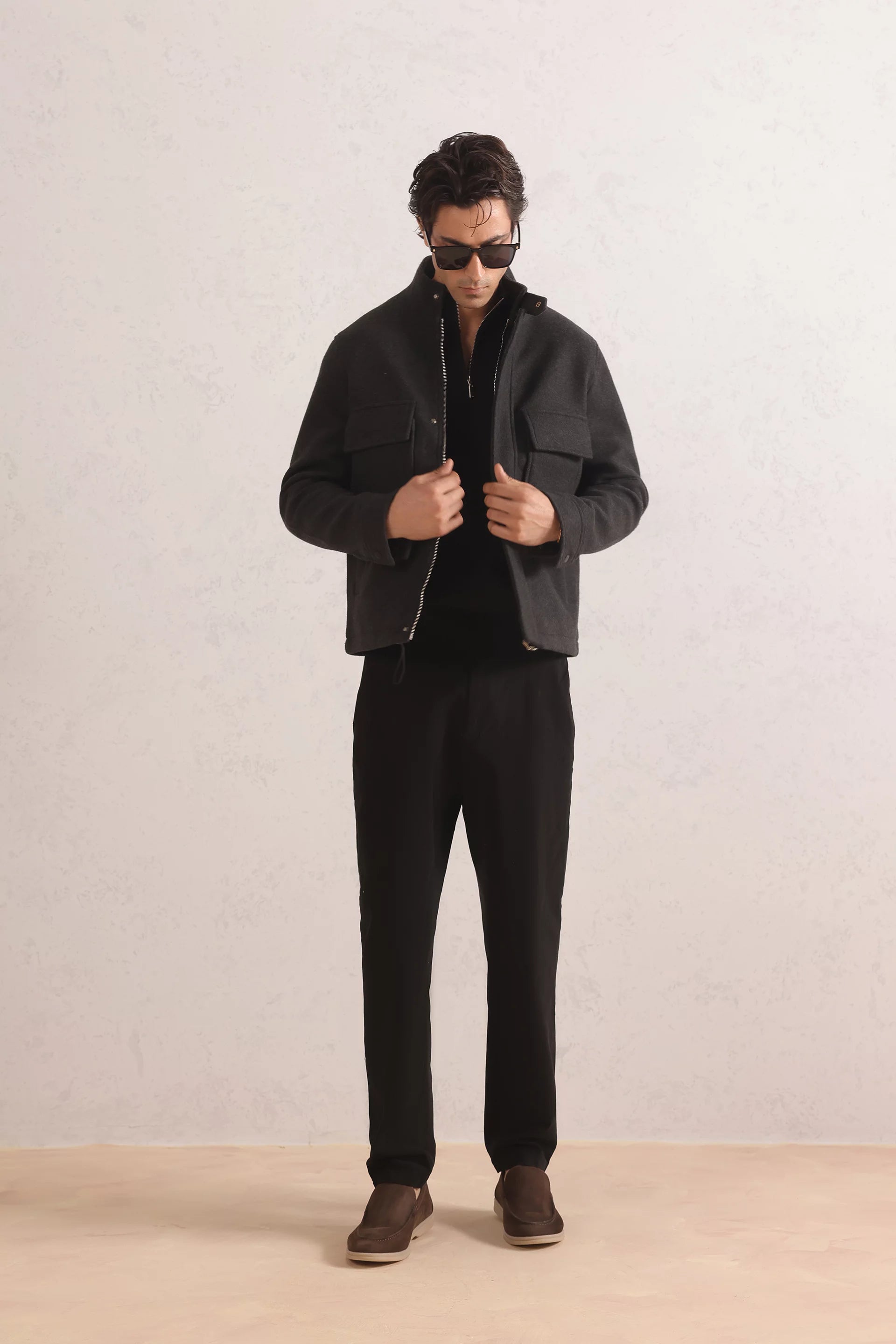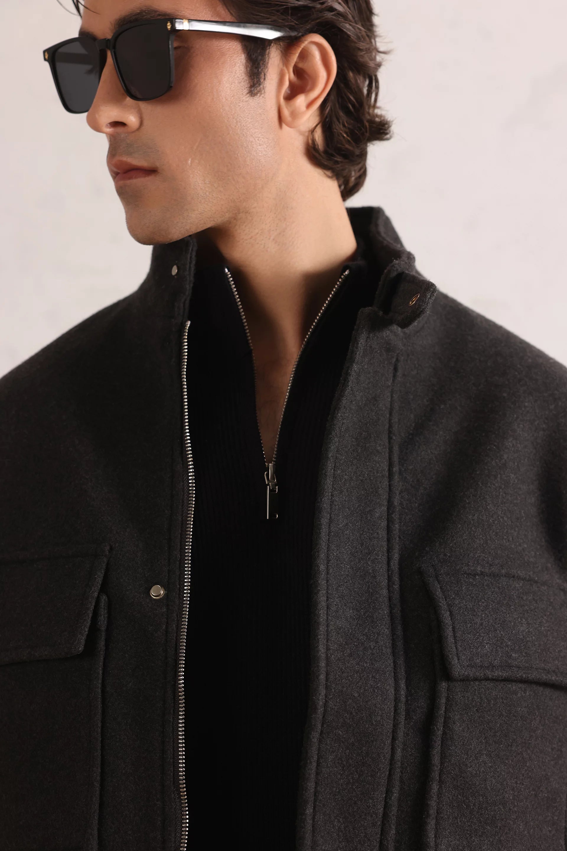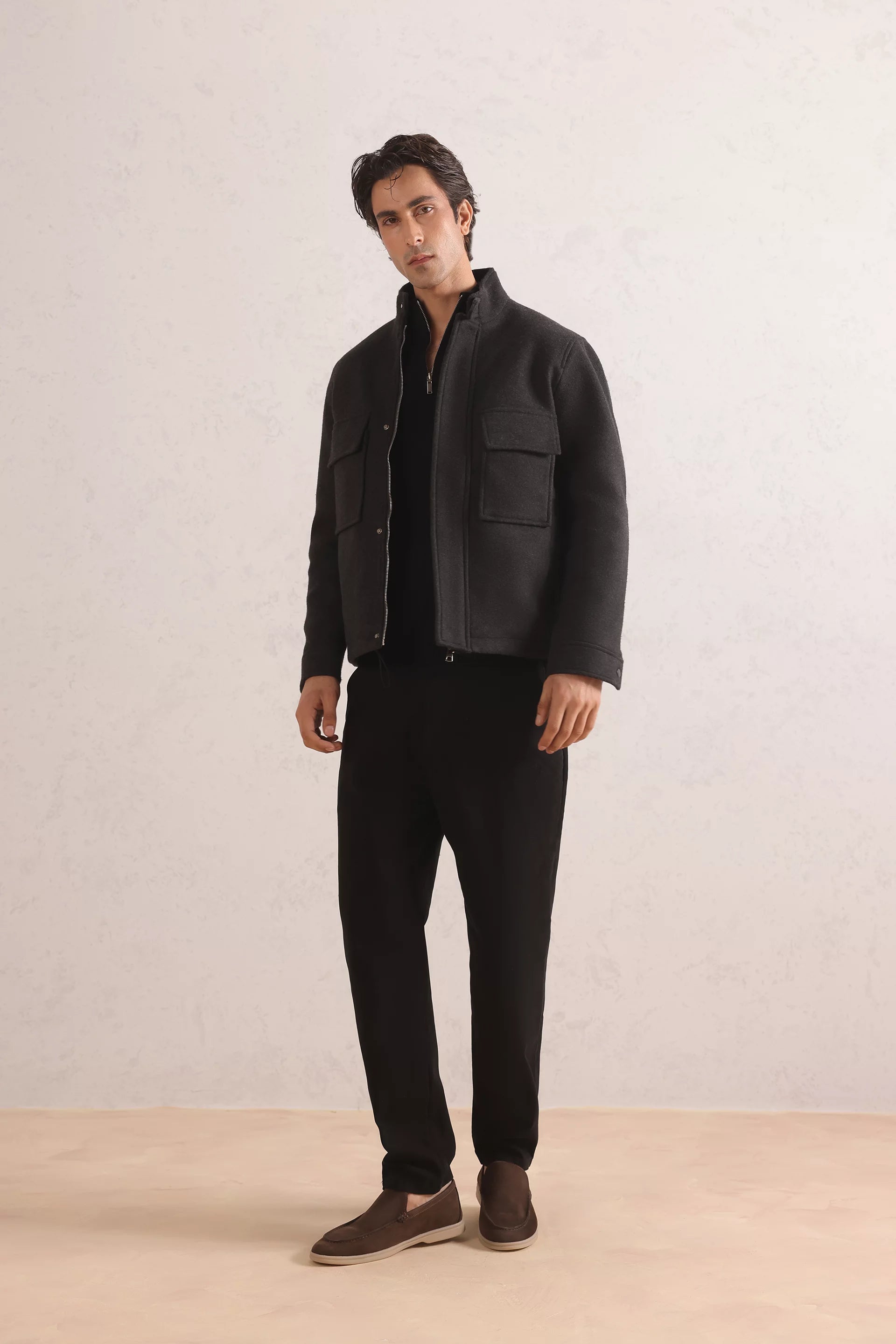 Design Details: Stand collar with snap-button tab closure, zip front, flap pockets and side welt pockets, simple stitching outlining the major seams, rugged aesthetics