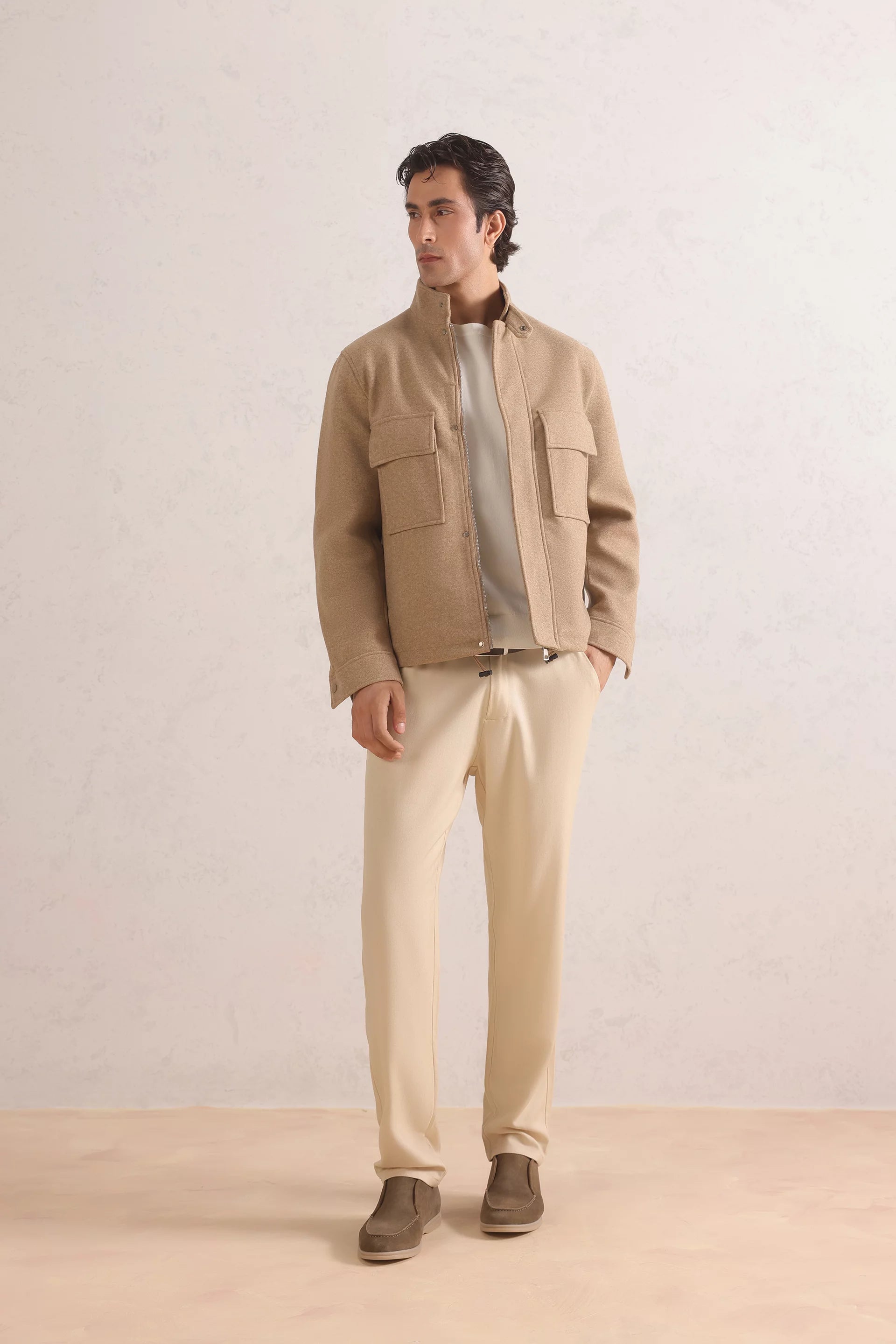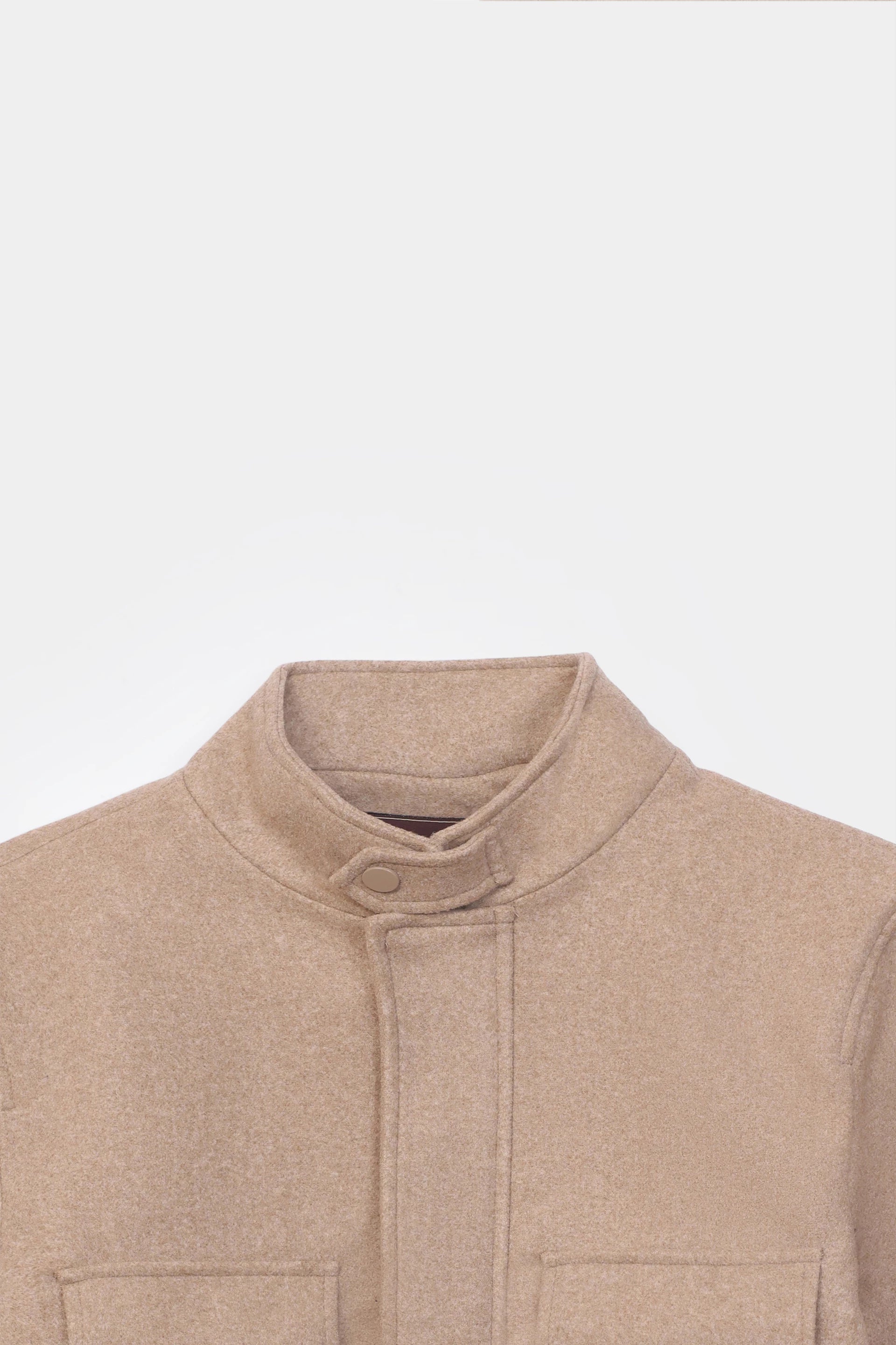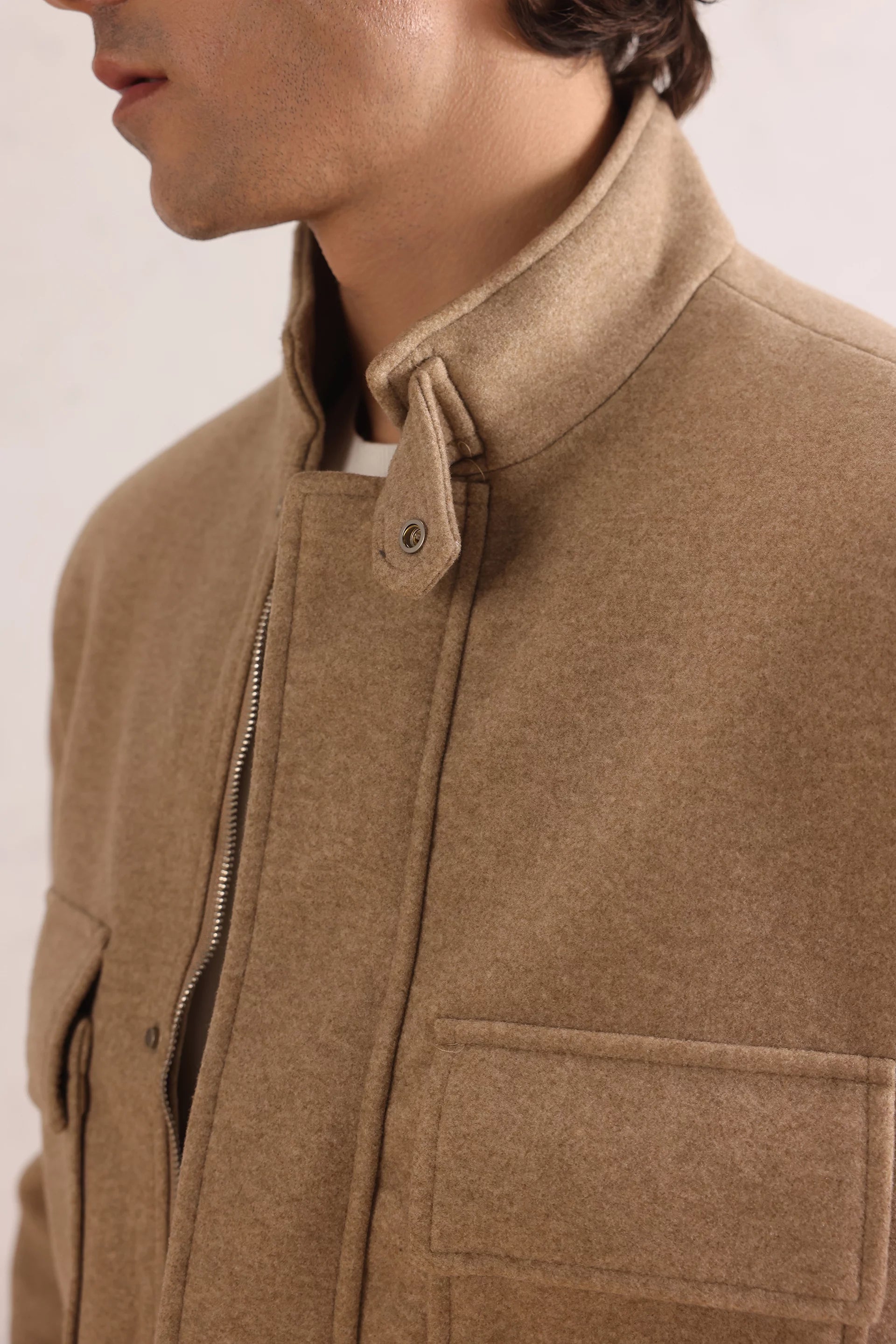 Design Details: Stand collar with snap-button tab closure, zip front, flap pockets and side welt pockets, simple stitching outlining the major seams, rugged aesthetics